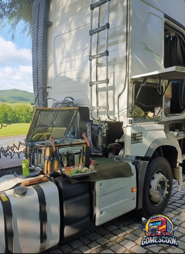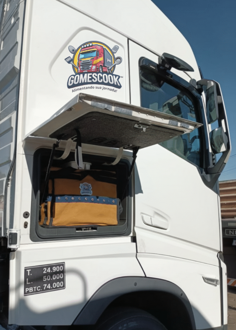 A Gomescook cabe no banco do carona, na lateral do caminhão ou no compartimento da cabine. Pronta para entrar em ação quando você quiser. Sem instalação, sem complicação. É só ligar — e cozinhar.